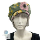 This beautiful fall and winter season beret is handmade in a soft fleece fabric. It feels lightweight and warm with such a cute floral design in green, pink and yellow.