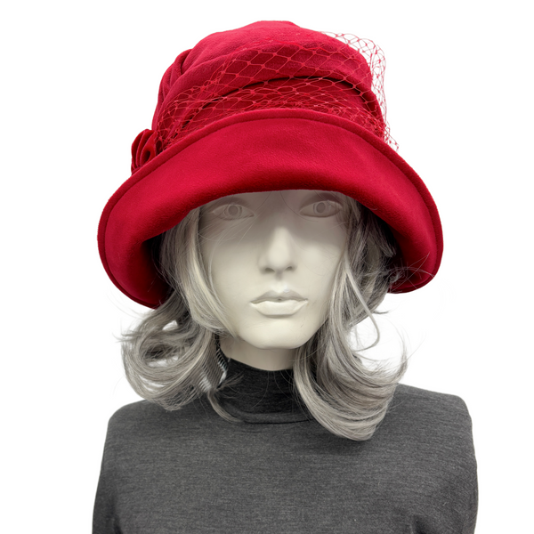 Alice Red Velvet Cloche Hat with Velvet Flower and French Net Band