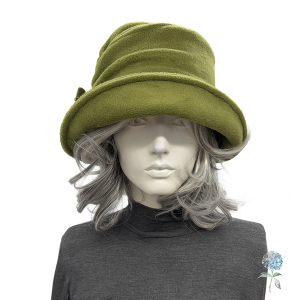 Step into timeless style with this beautifully handcrafted Alice cloche hat. Made from ultra-soft, luxe warm chartreuse fleece, it offers cozy comfort while maintaining a refined, vintage silhouette inspired by early 20th-century fashion.