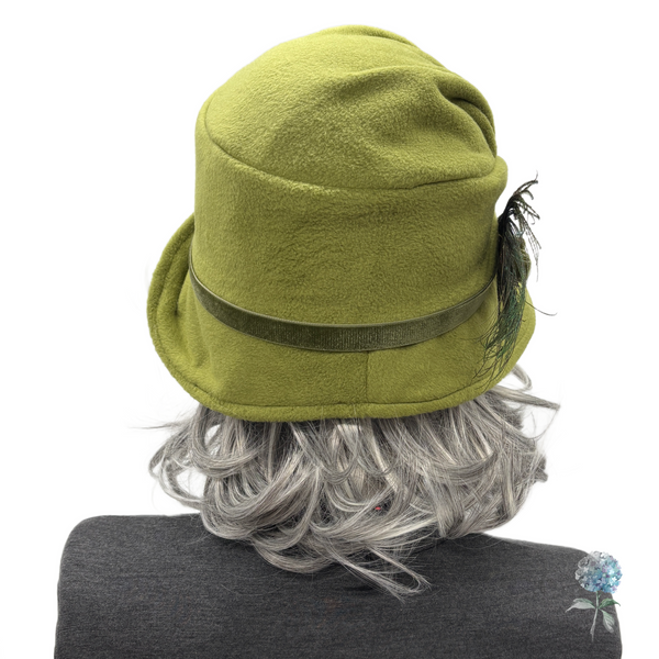 Chartreuse Fleece Alice Cloche – with Velvet Bow & Peacock Feather Accent